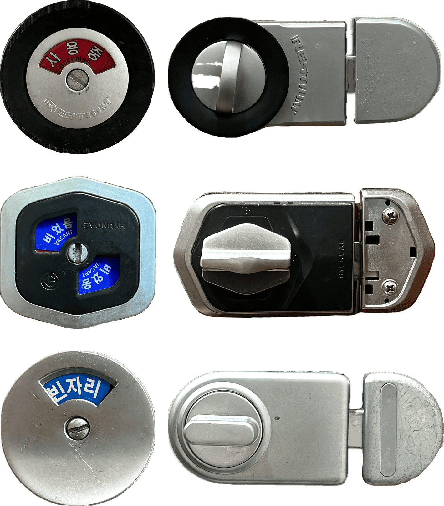 화장실의 잠금장치는 내습성과 내구성을 높이기 위해서 스테인리스 또는 알루미늄 등 금속으로 주로 제작됩니다.
